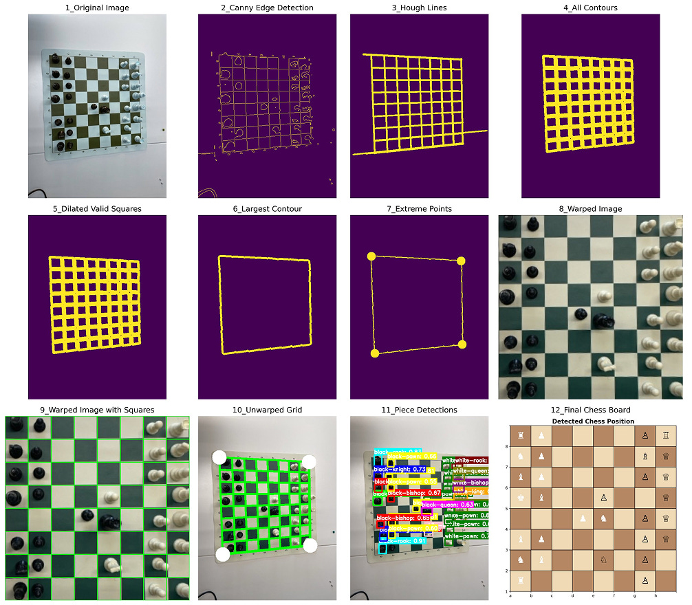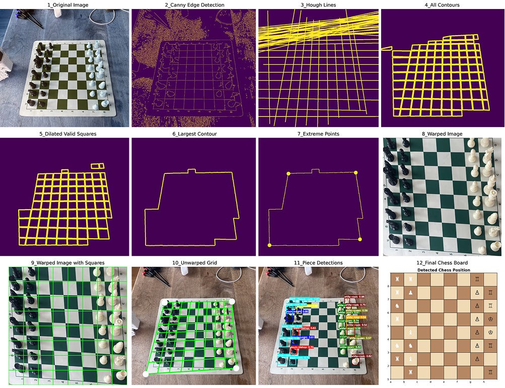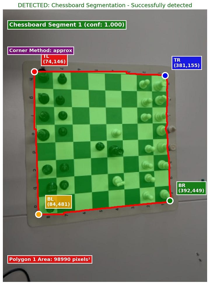 I trained a YOLO-based segmentation model, with which I could then crop and warp the board, overlay an 8×8 grid, and map each square. Then I added an object detection model for the pieces and voilà: the current position. I could feed that into a chess engine (Stockfish) to predict the next move. The only thing left was for the robot to execute the move.